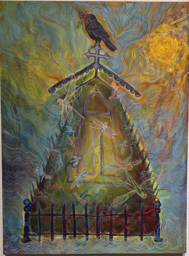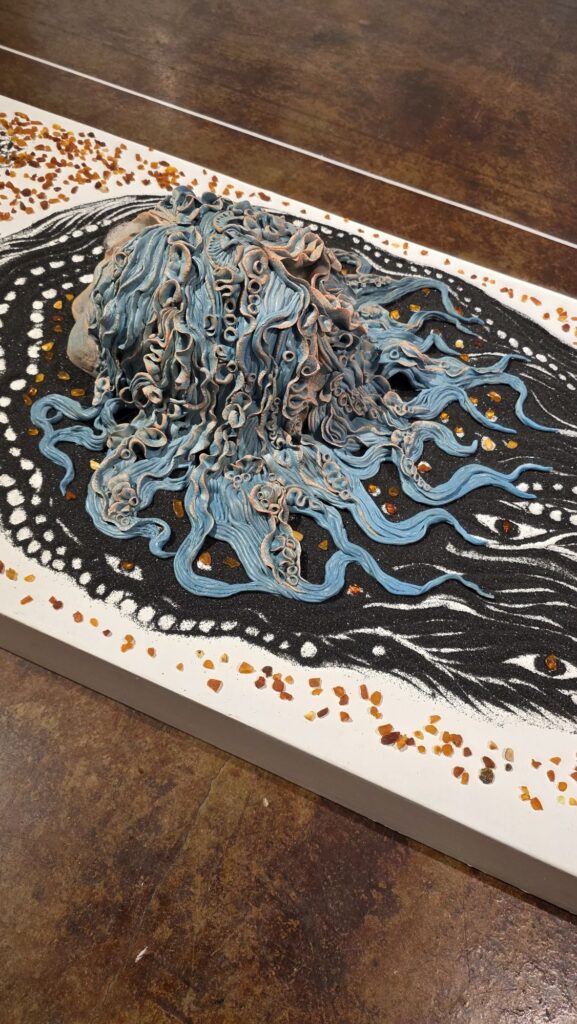 epoxy clay, clay, mesh, acrylic paint, wool, LED light, black sand, amber